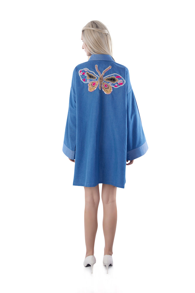 A denim shirt dress with loose fitted sleeves & a butterfly patchwork at the back. Perfect for your travel look.