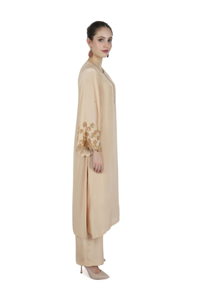 A long silk kurta with scalloped sleeves, intricately hand-embroidered with beads, paired with straight pants in natural crepe silk.