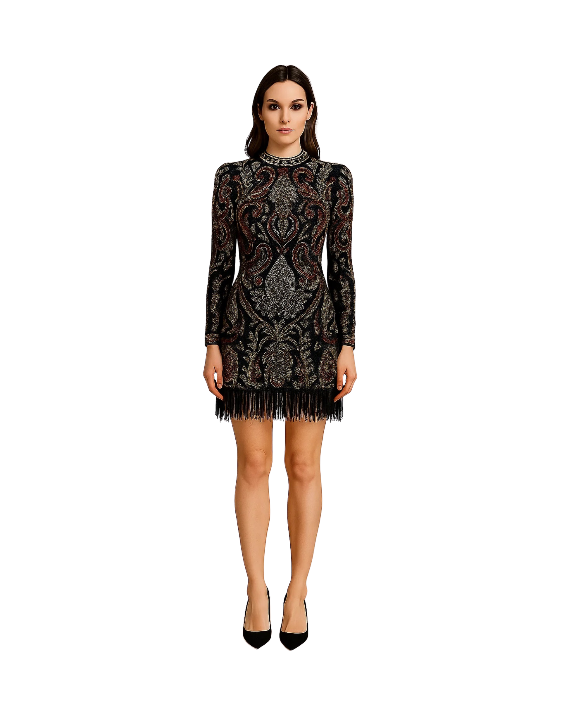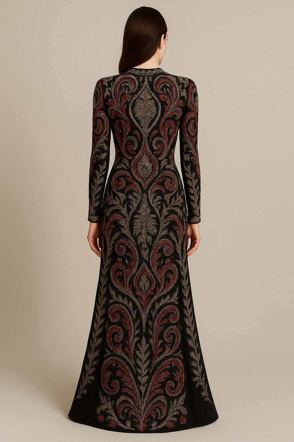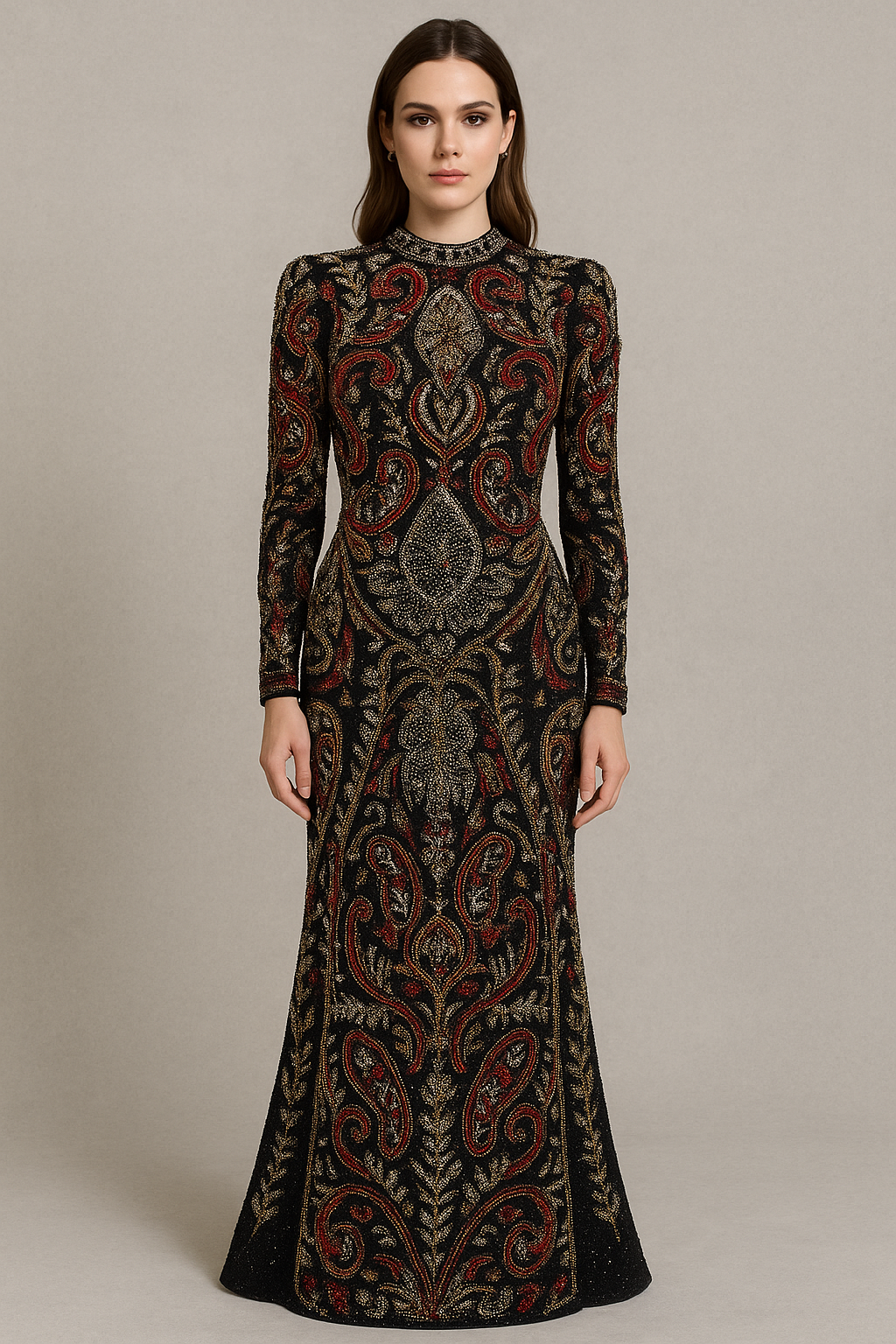 Majestic Noir Gown features crafted from imported stretchable mesh and lined with four-way lycra, this full-sleeve gown stuns with its intricate crystal stone embroidery in rich gold and red hues, creating a regal baroque-inspired masterpiece.
