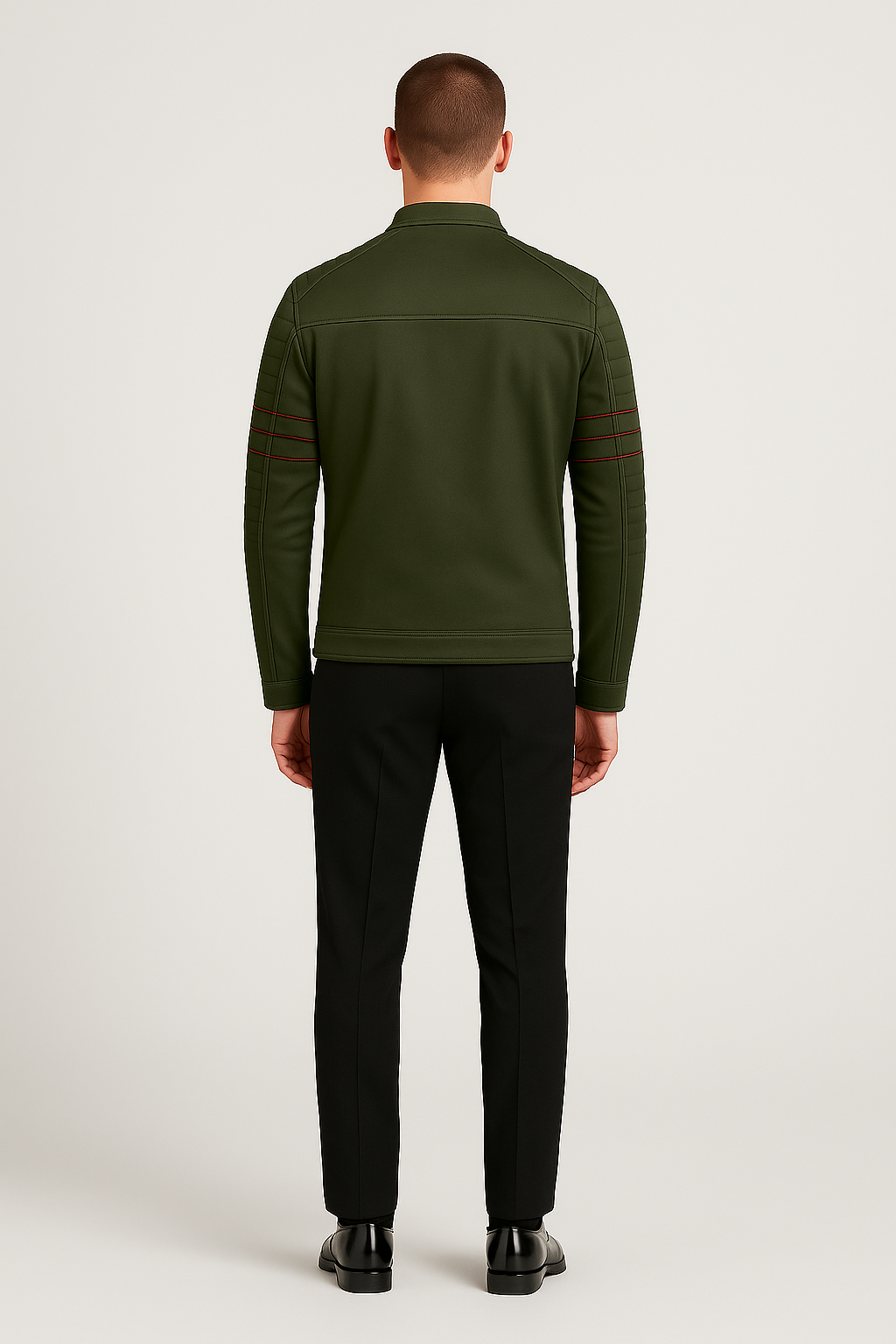 Crafted from premium olive green leather 🐂, it features striking red contrast stitching 🔥, zippered chest pockets 🛡️, and quilted panel detailing 🧵 for a refined, high-performance look.