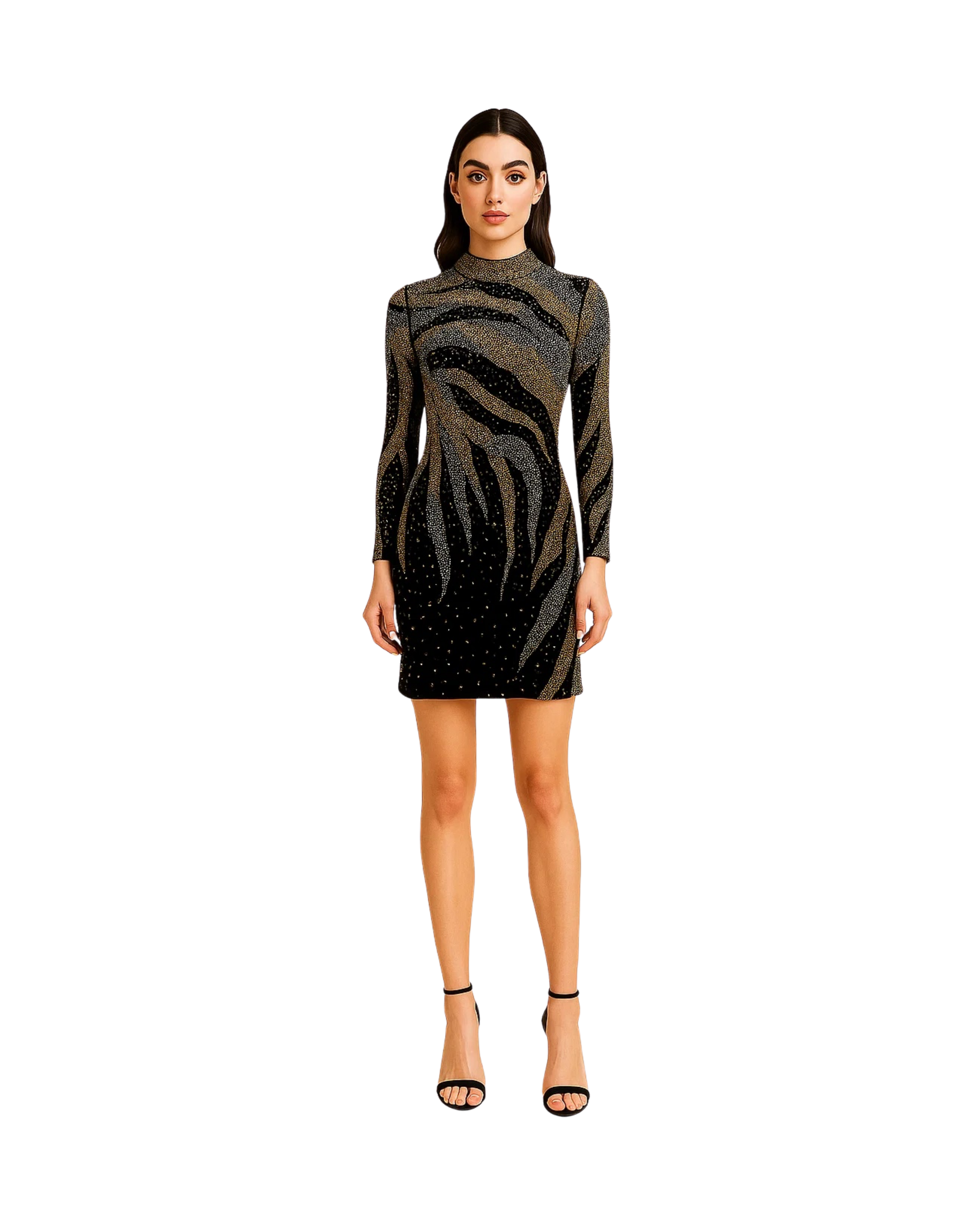 Celestial Flame black gown features a high neckline and full sleeves, accentuated by gold and silver sequin embellishments that swirl like flames across the body.
