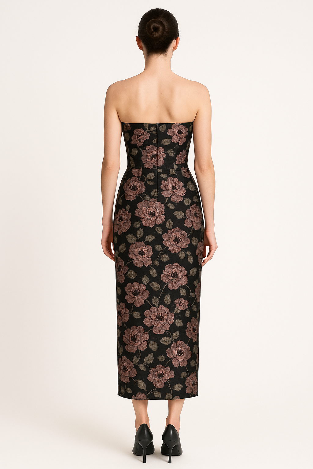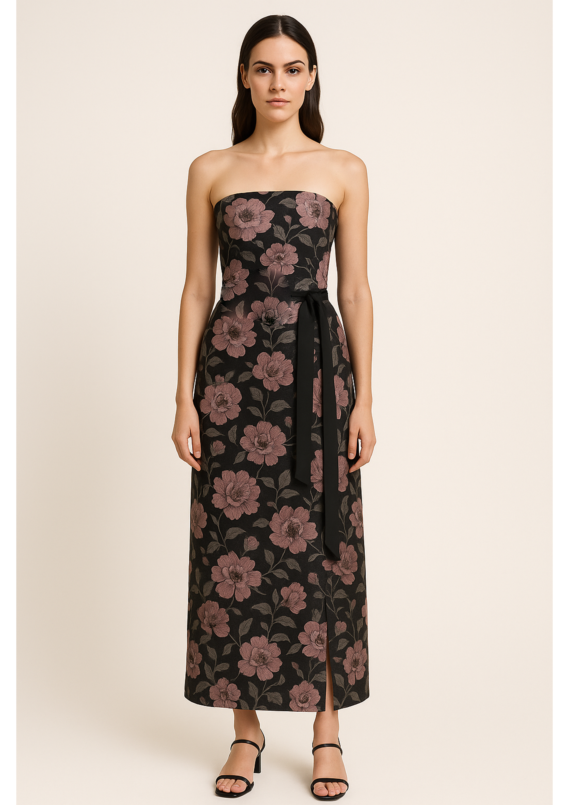 This elegant strapless black gown features a delicate all-over floral jacquard in soft rose and muted olive tones. Designed with a sleek silhouette, it includes a side tie-up belt for added definition and a graceful fall. Perfect for evening soirées or formal occasions.