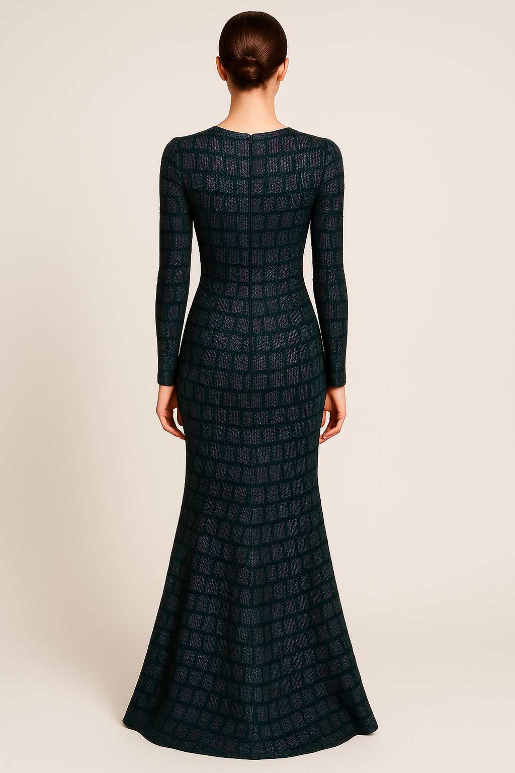 Dragon Tiles Gown Crafted from imported stretchable mesh and lined with four-way lycra, this full-length gown dazzles with geometric crystal stone embroidery features an intricate checkered pattern.