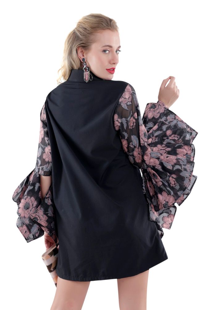 Elevate your style with our 'Floral Pleated Sleeve Shirt Dress'. Made from cotton poplin, it features chic black design with floral printed organza pleated sleeves.
