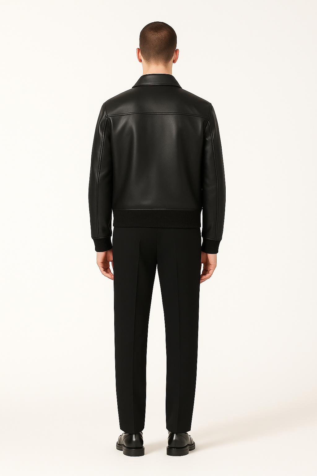 Crafted from high-quality genuine leather 🐂 with a subtle sheen finish ✨, this minimalist black jacket features a structured silhouette, oversized flap pockets, and a streamlined zip closure, creating a refined, commanding presence.