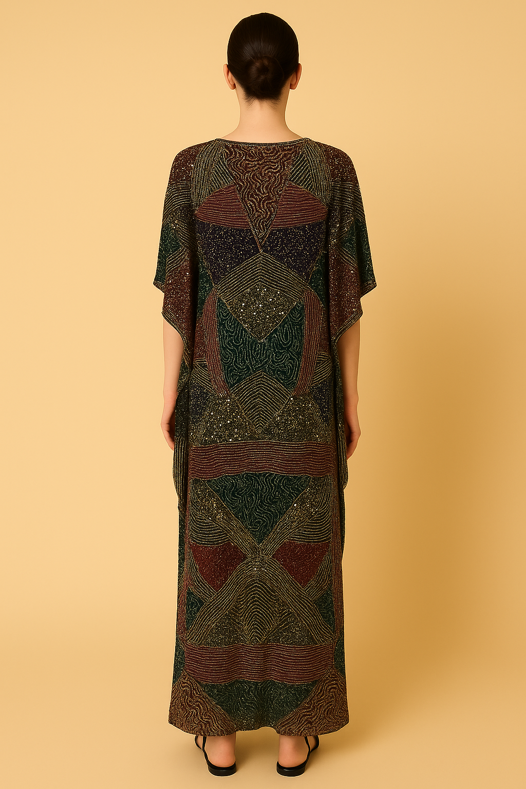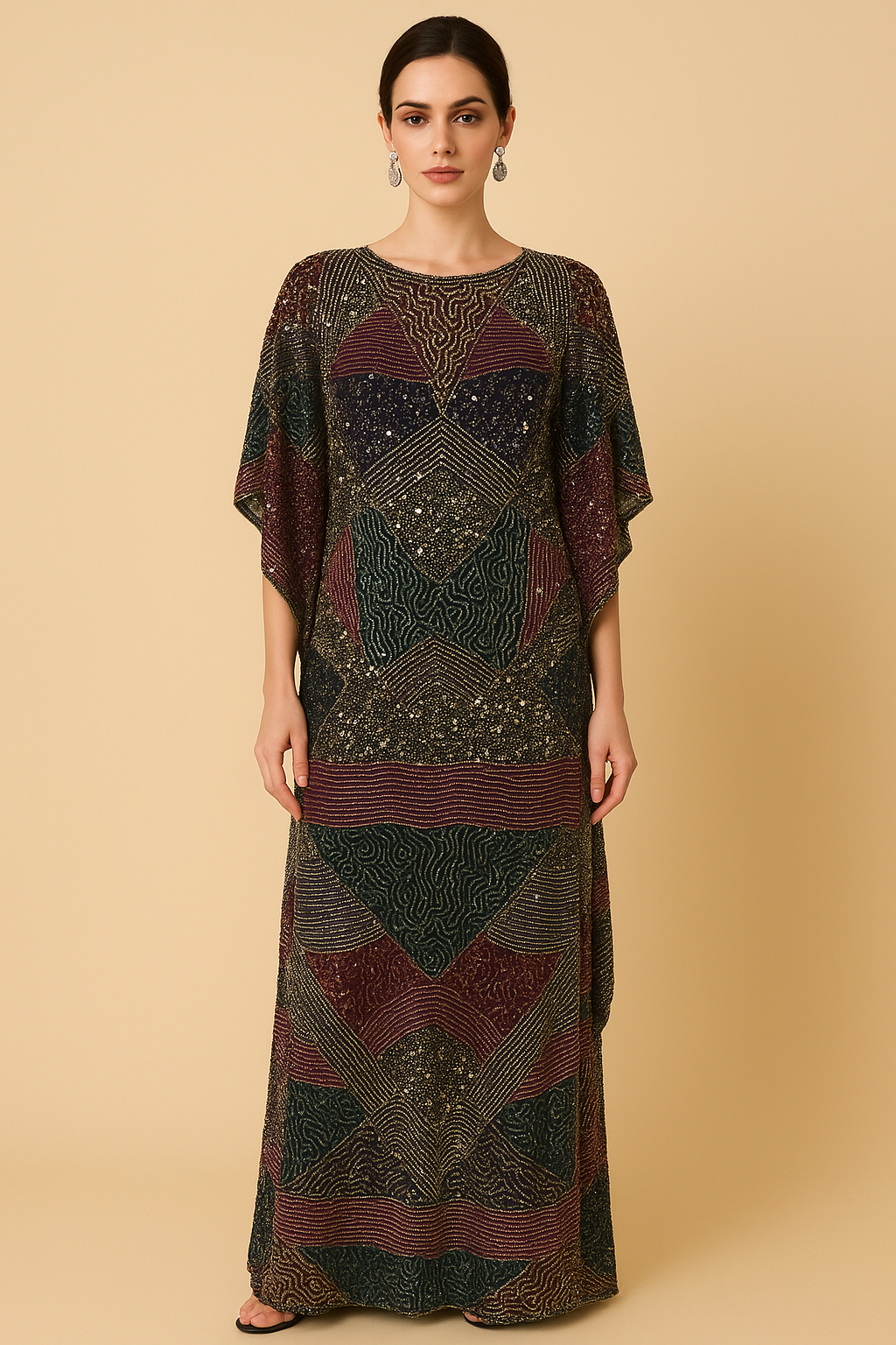 Embellished with bold geometric motifs in rich jewel tones, the gown is intricately adorned with hand-applied beadwork and sequins, capturing the essence of golden hour light in every glimmer and angle. The flowy structure flatters all body types, making it a versatile choice for luxurious escapes, festive evenings, and formal gatherings.