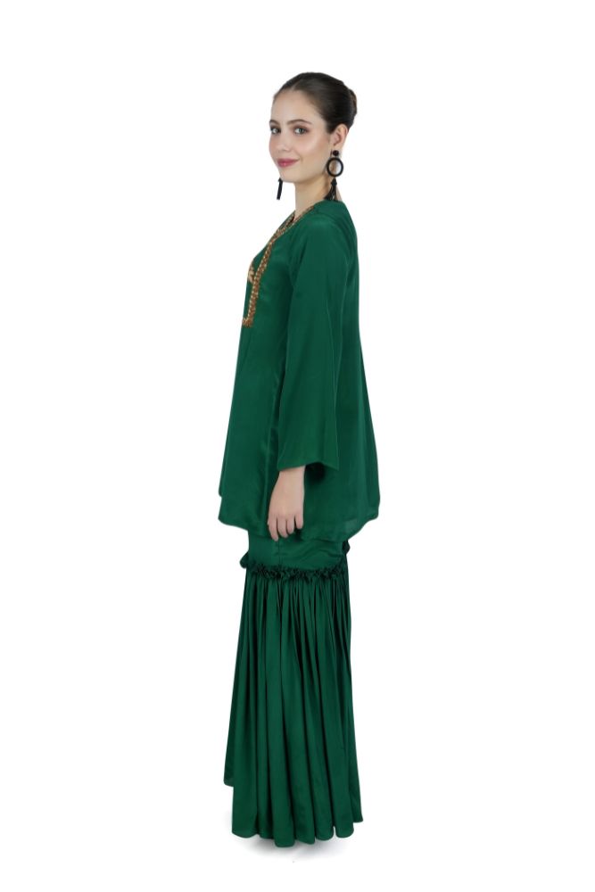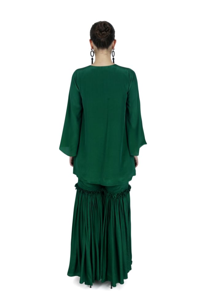 Made from natural crepe silk and , a green short kurta with hand-embroidered neckline, paired with gharara pants, accompanied by a printed organza dupatta.