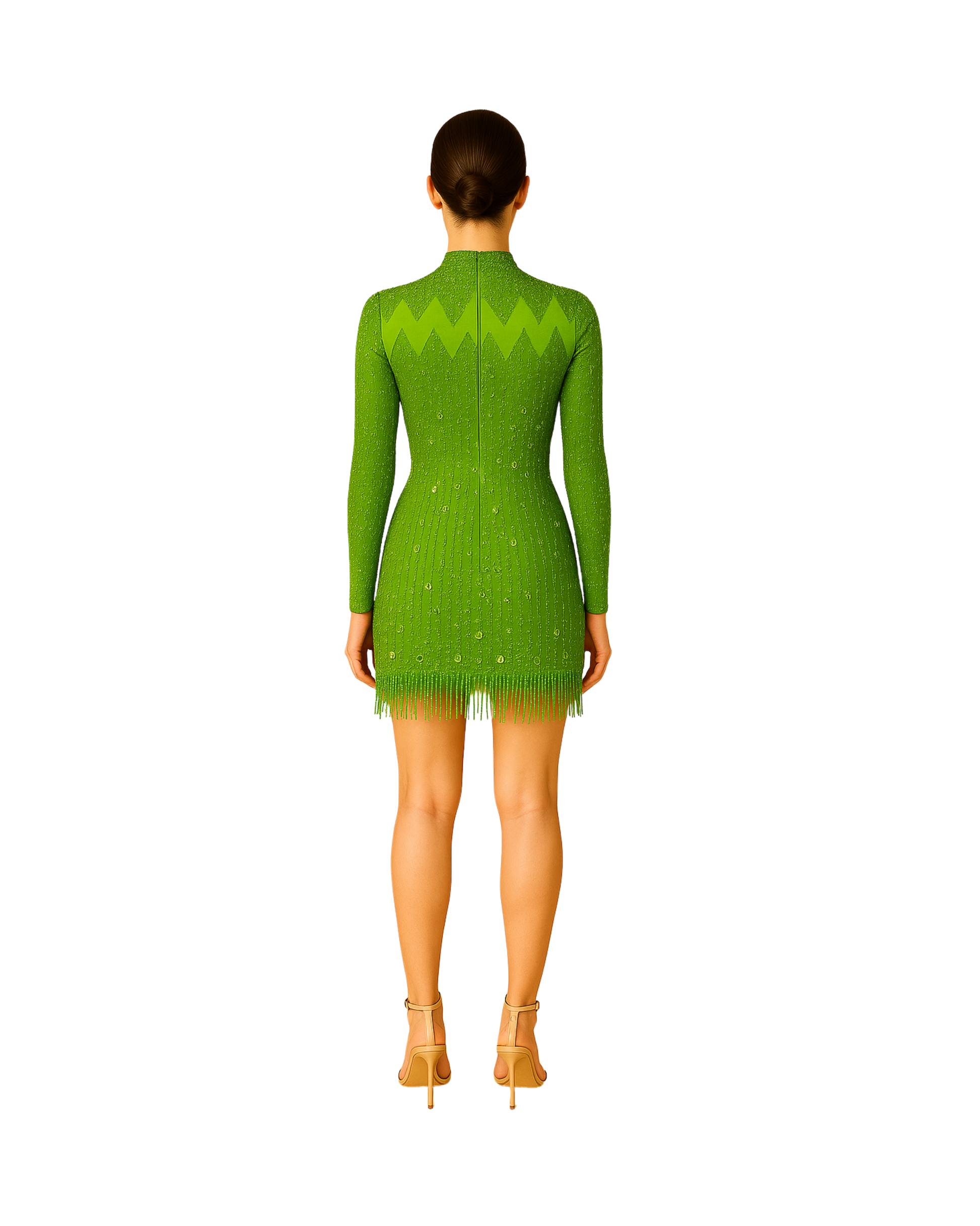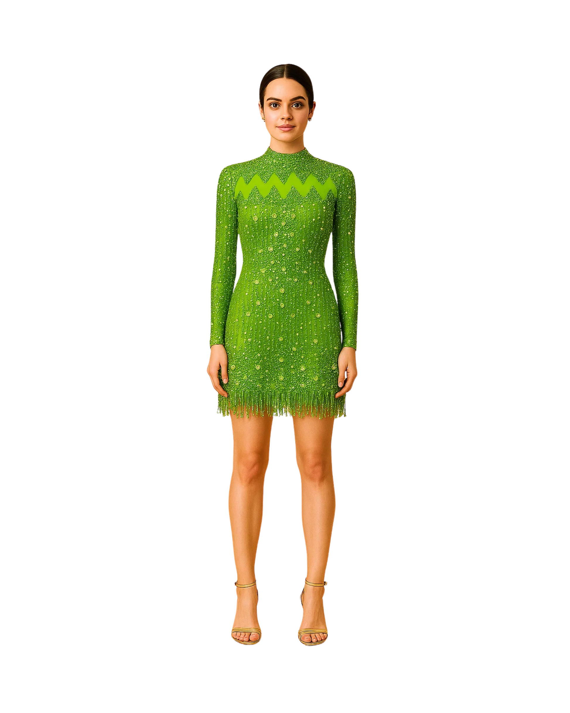 Lime Mirage Echo Gown features a high neckline and full sleeves, highlighted by a striking zigzag panel at the chest. Cascading sequin embellishments flow throughout the garment, intricately embroidered with crystal stones.