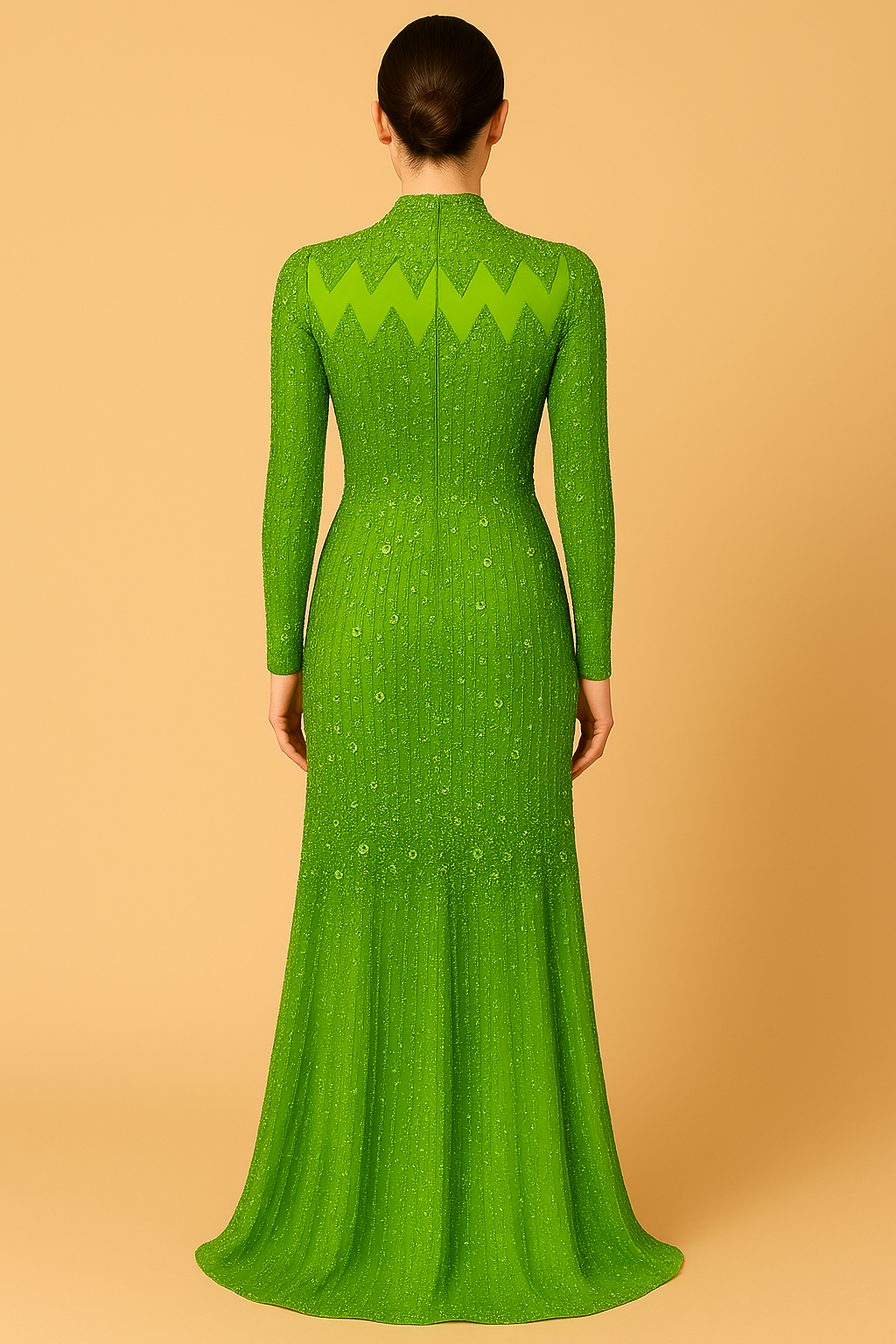 The Lime Mirage Echo Gown stands out with its sleek high neckline and full-length sleeves, creating a structured yet fluid silhouette. A striking zigzag panel at the chest draws the eye, introducing an architectural element to the otherwise fluid form.