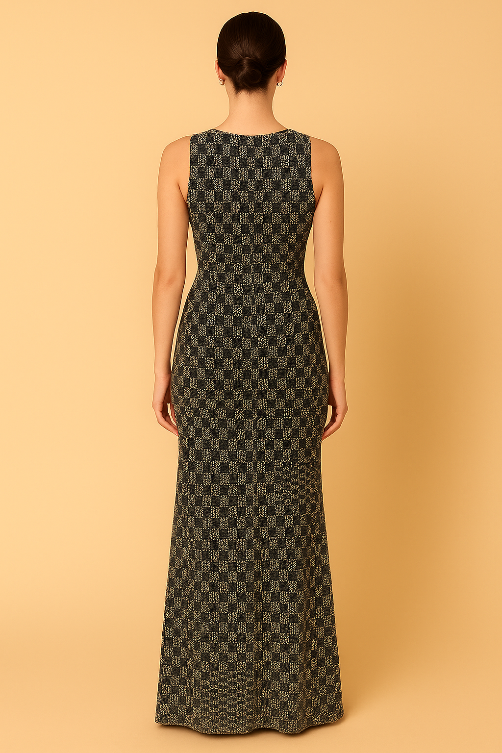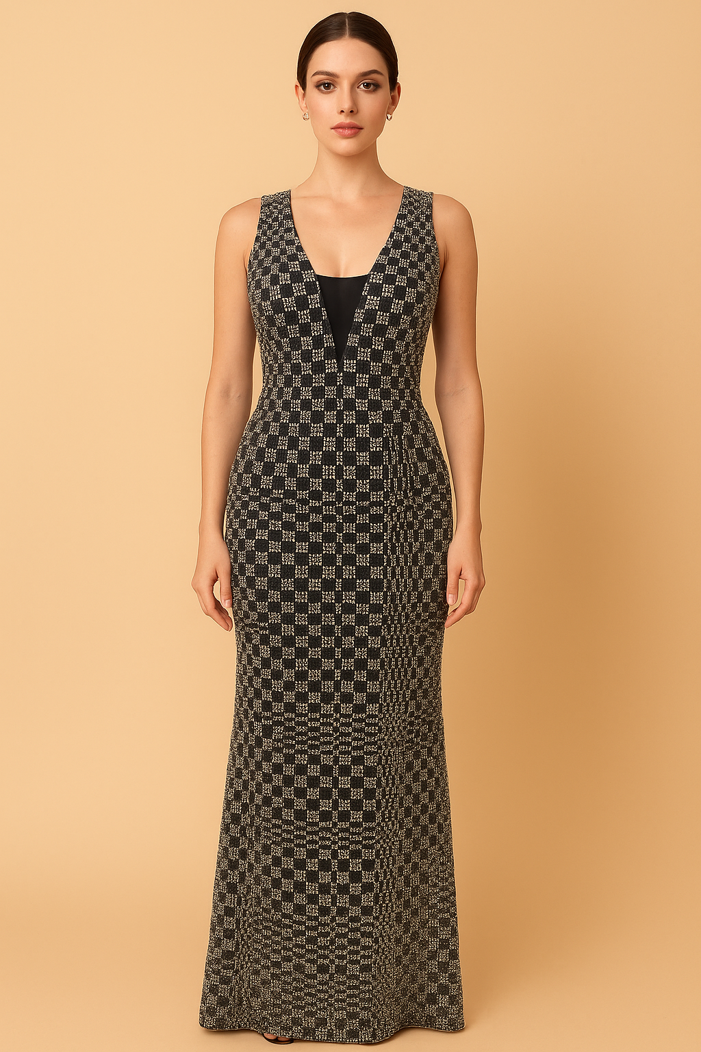 Sleeveless floor-length Lunar Prism gown features a bold geometric checkered pattern with a deep V-neckline layered over a contrasting black.