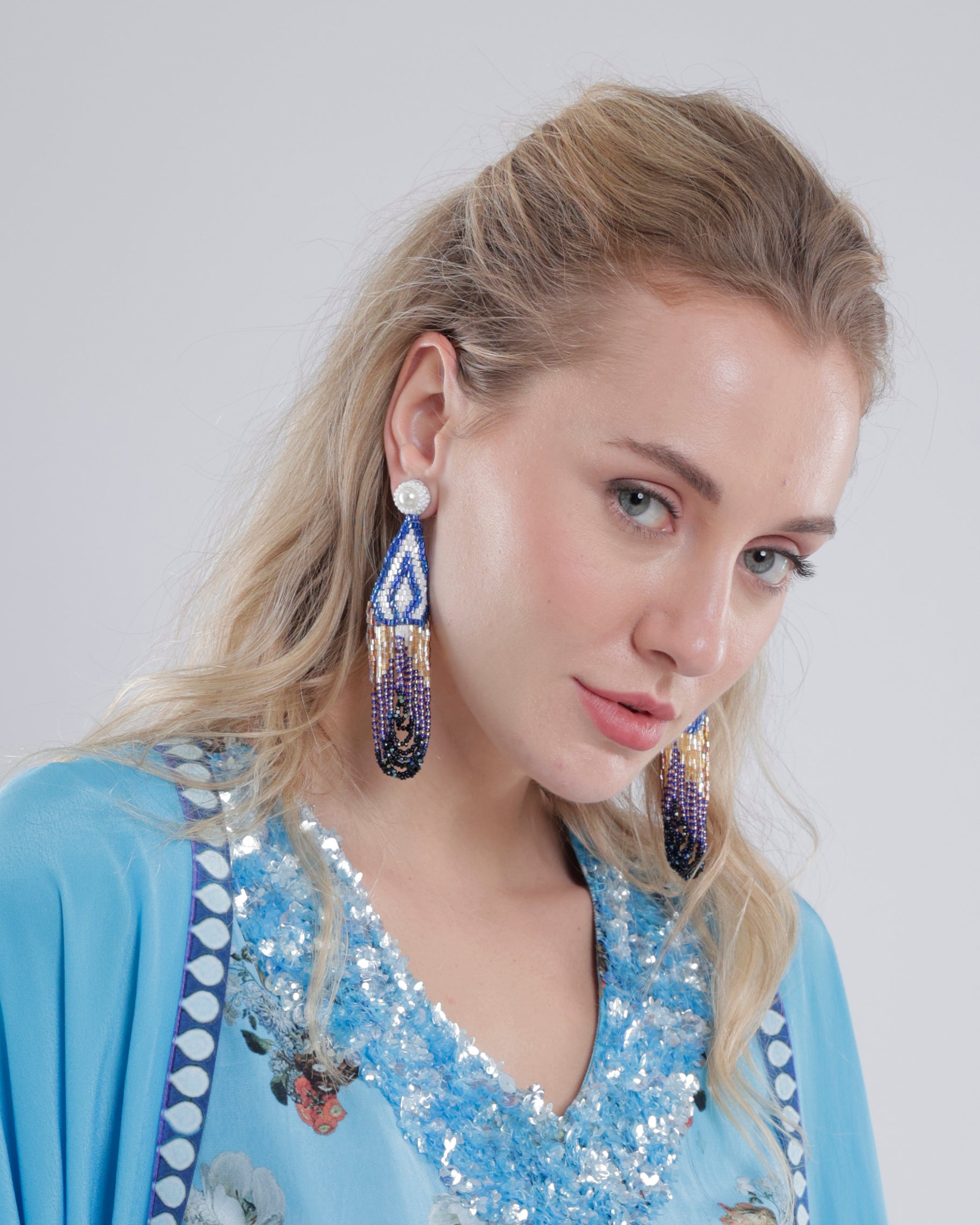 A serene blend of blue, white, and cream beads defines these earrings, elevated by shimmering glass-cut accents. The intricate weaving on a cotton base creates a design of understated elegance and beauty.