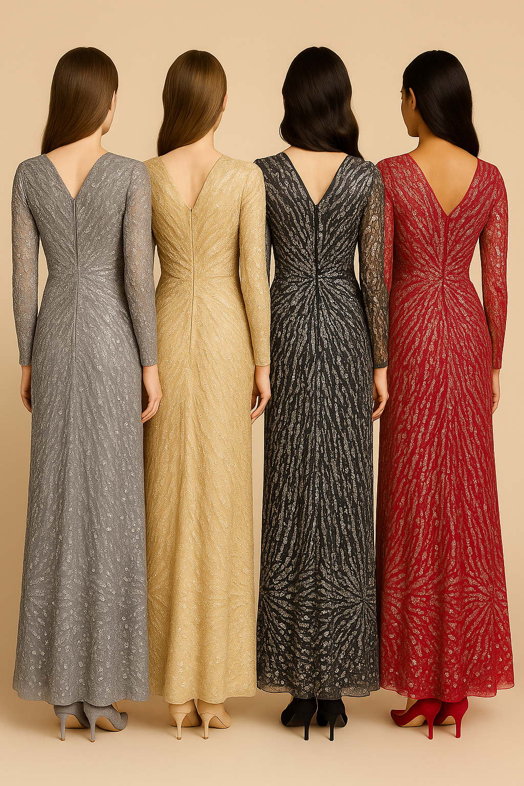 These full-sleeve, body-hugging gowns feature a plunging V-neckline and are embellished with radiant sequin embroidery in an intricate starburst pattern. Crafted from imported stretchable mesh and adorned with shimmering crystal stones, they are available in striking shades of silver, gold, black, and red