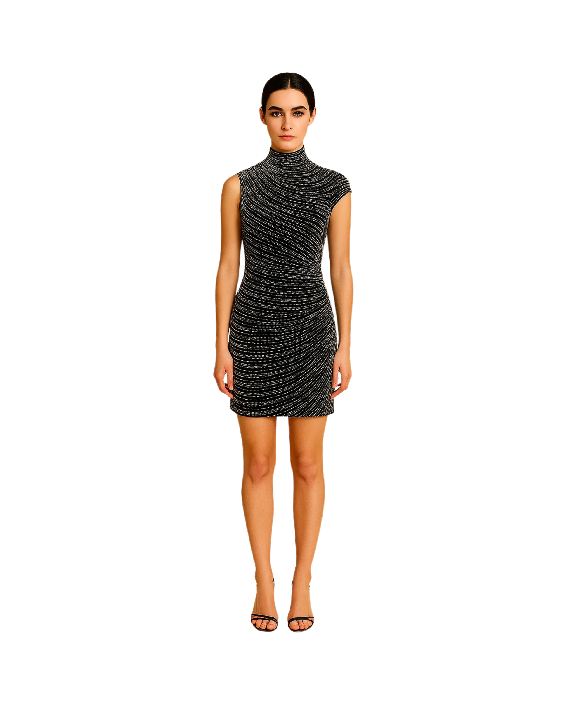 This sophisticated evening gown features a one-side cap sleeve and a sleek turtle neckline, offering a statuesque silhouette. Meticulously hand-embroidered with shimmering crystal stones, it radiates understated glamour with every movement.