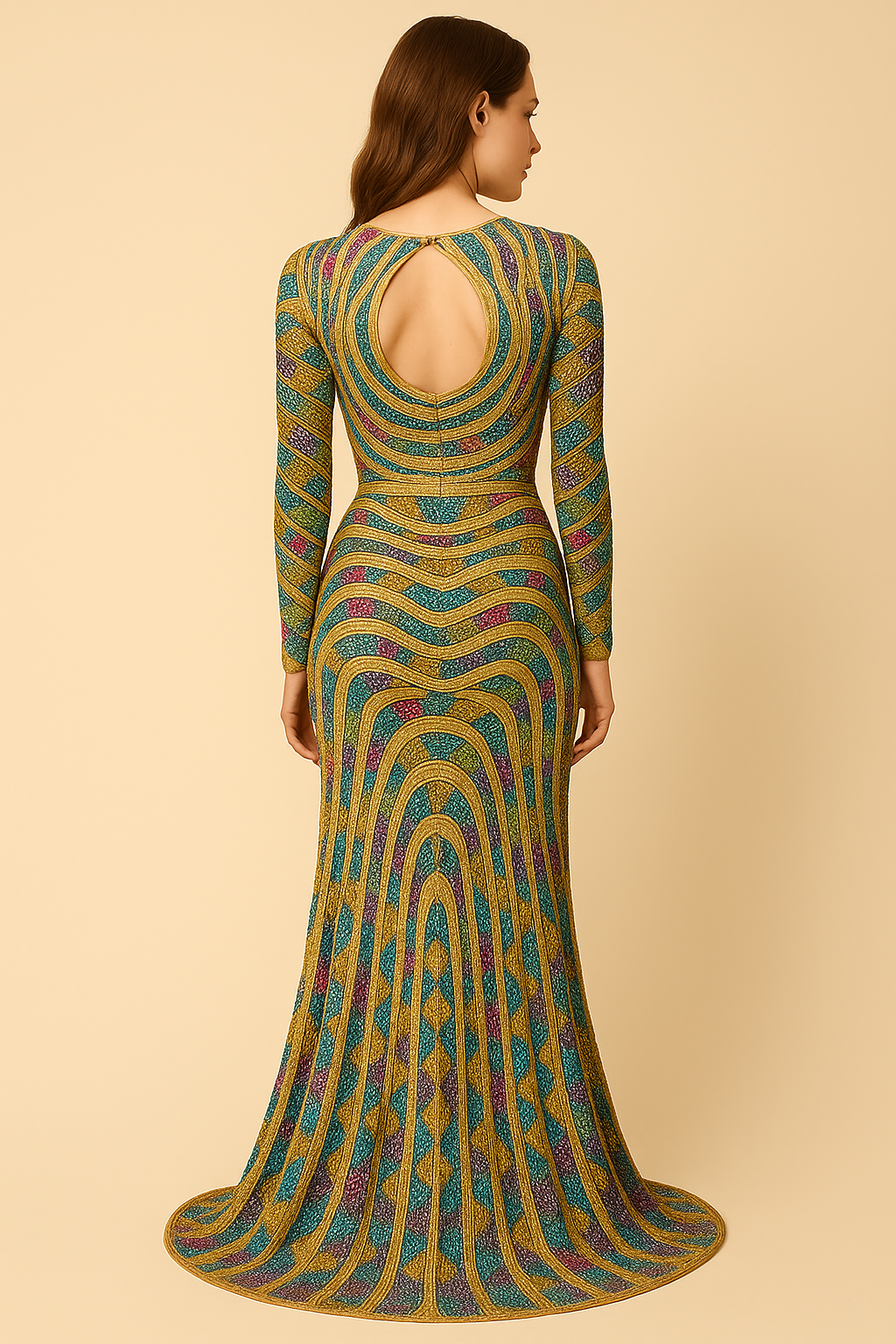 Sunstone Spiral Jewel Gown showcases a hypnotic swirl and diamond pattern in vivid jewel tones, elegantly outlined with golden beadwork. The embroidery is enriched with crystal stones, adding luminous depth and texture. Crafted from imported stretchable mesh and lined with four-way Lycra.