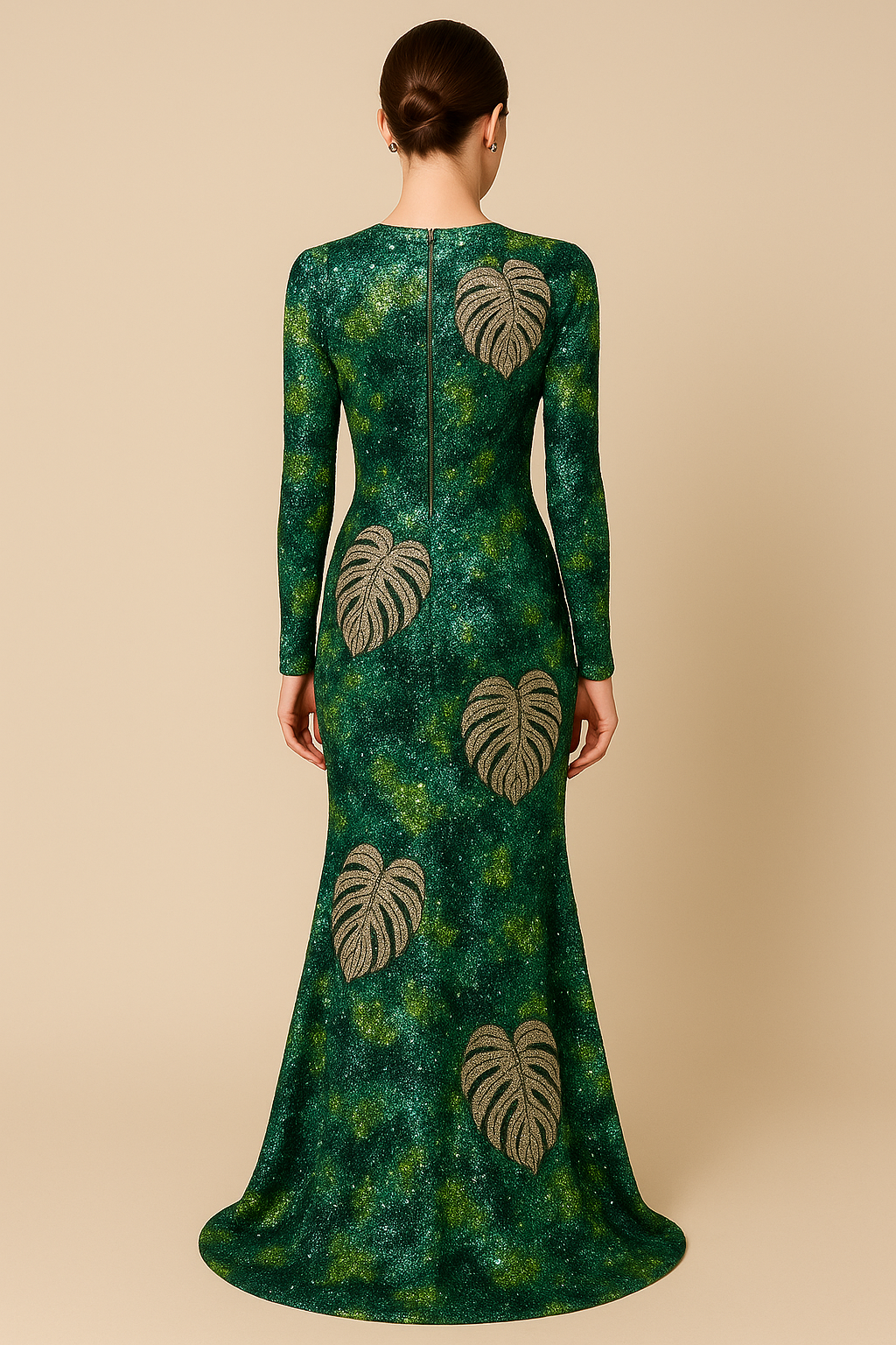 Tropical Forest gown is crafted from imported stretchable mesh with a four-way lycra lining, and features intricate crystal stone embroidery in bold Monstera leaf motifs, bringing a lush, botanical elegance.