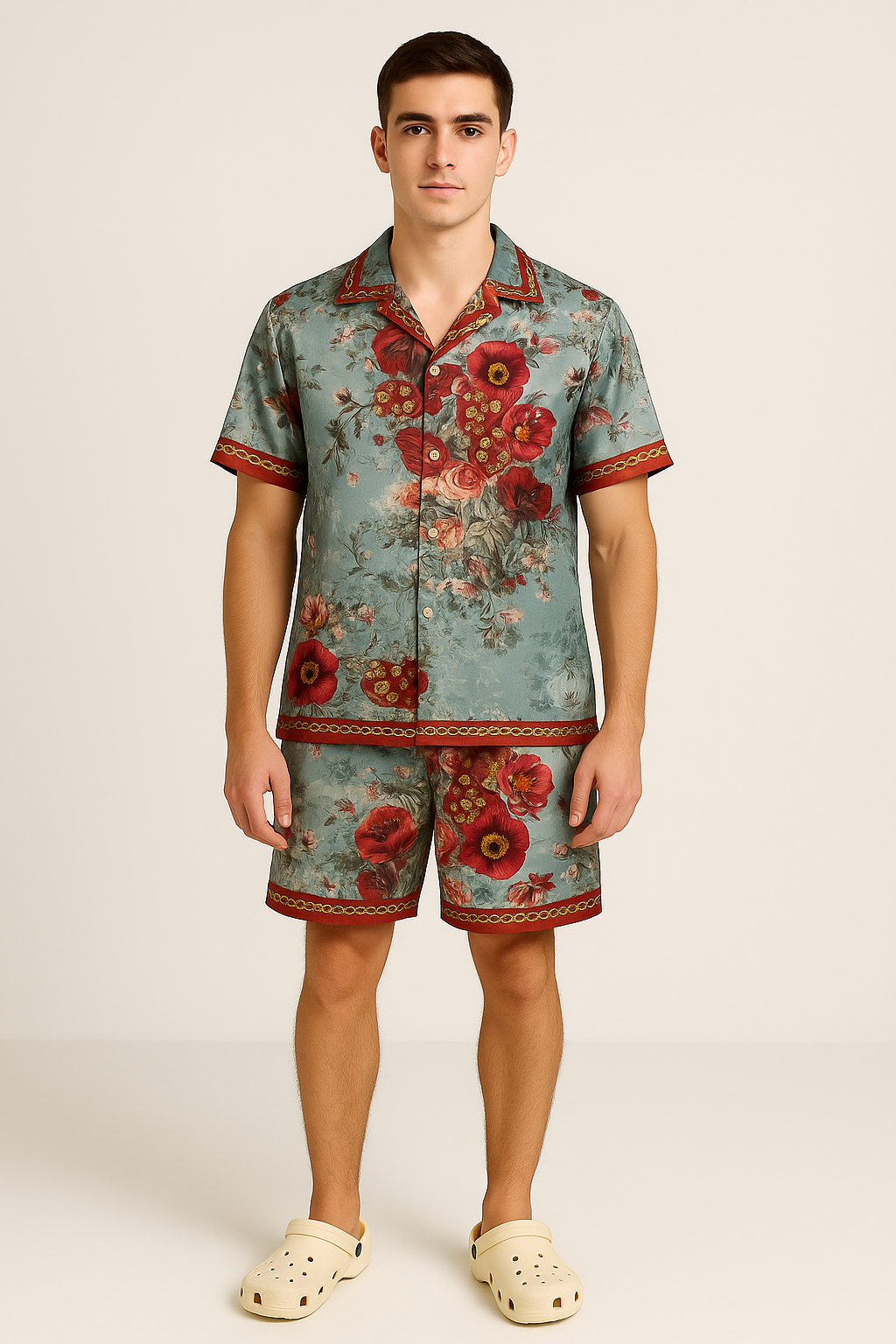 Elevate your resort wardrobe with the Victorian Poppy Co-ord Set, where painterly florals meet royal elegance.